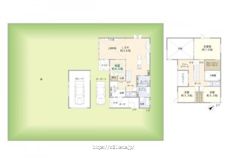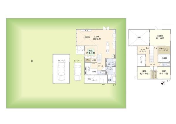 階数 区分 広さ 1F 和 4.5帖 2F 洋 10.0帖 2F 洋 5.3帖 2F 洋 5.3帖 1F LDK 26.0帖 - 駐車場