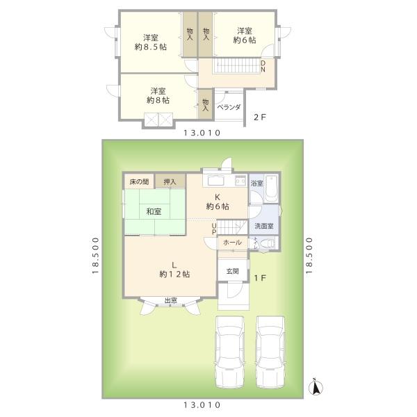 階数 区分 広さ 1F LDK 18.0帖 1F 和 6.0帖 2F 洋 6.0帖 2F 洋 8.5帖 2F 洋 8.0帖 - 駐車場